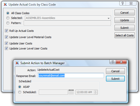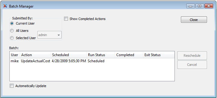 In this section we will run one of the many jobs that can be processed through the Batch Manager. The job we will use for this scenario is an Actual Cost update. This is a perfect candidate for a Batch Manager submission because it is a resource-intensive operation involving multiple database updates. Depending on the number of Items in your product catalog, an Actual Cost update can take up to several hours to complete. As a general rule, these kinds of jobs are better run after hours―when the server is not busy with production requests from multiple logged-in users.