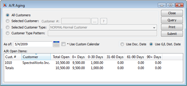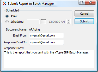 As you can see, the A/R Aging report screen has a SUBMIT button. To send this report to the Batch Manager for email processing, follow these steps: