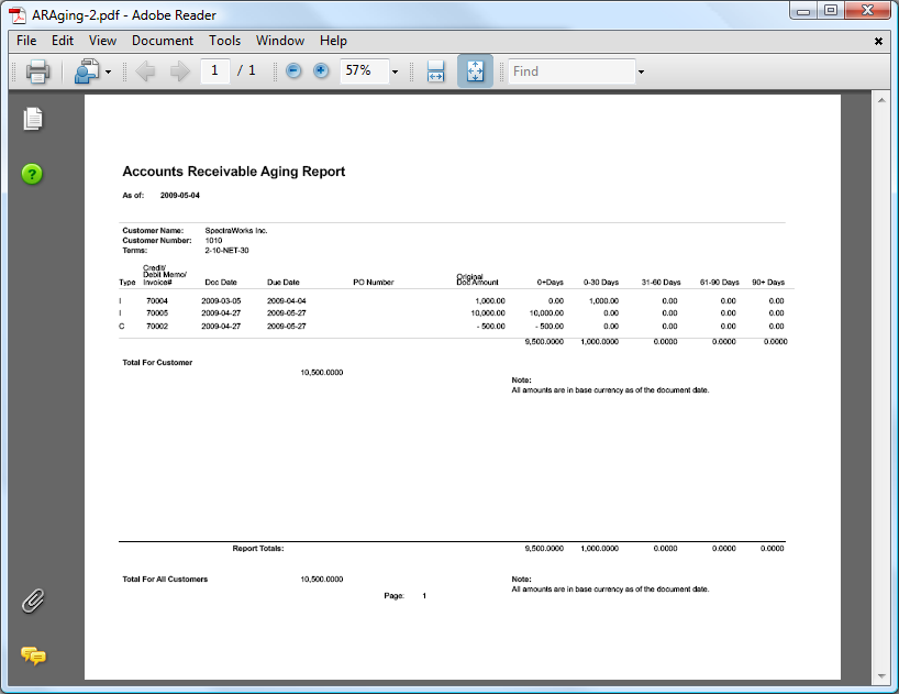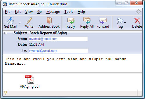 When you select the SUBMIT button, the report will be sent to the Batch Manager for processing. And in the following screen, we see an example email with the A/R Aging report attached in .PDF format: