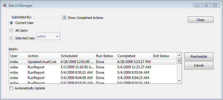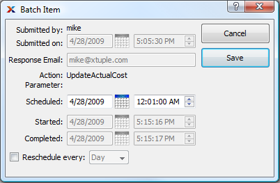 For this exercise, we will reschedule the Update Actual Cost job which we originally described in Section 1.1, “Submitting Jobs”. This job is the first one listed in the screenshot shown above. To make this a recurring job, follow these steps: