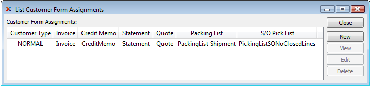 As you can see in the screenshot, the Customer Form Assignments are based on Customer Type. This means that whenever Invoices are printed for or emailed to a Customer, the Form assignment for that Customer's Customer Type will be used. In this example, no changes are required. However, there may be cases where you would want to associate different Invoice Forms with different Customer Types.