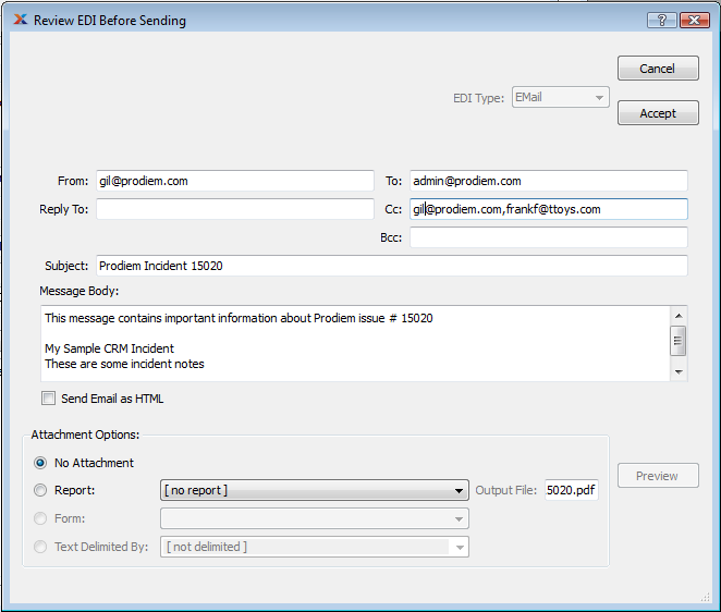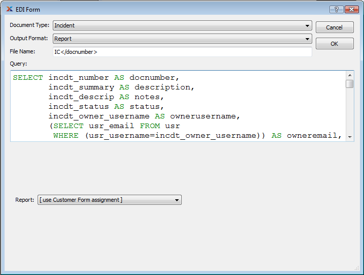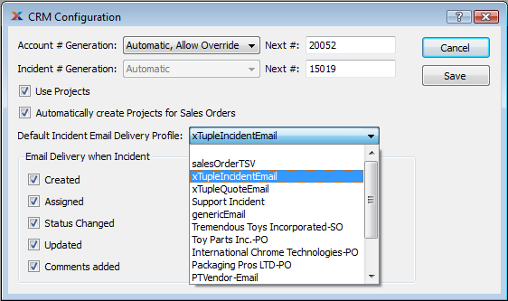 The xtbatch package includes a pre-defined EDI Profile for emailing CRM Incidents. This EDI Profile is called xTupleIncidentEmail and is one of only two EDI Profiles built in to the xtbatch package (the other is for Quotes). For this scenario, we will be configuring CRM to use this xTupleIncidentEmail EDI Profile for some but not all Incidents.