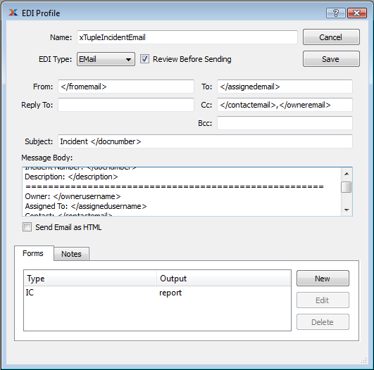 The xTupleIncidentProfile's EDI Profile showing the use of customized tokens and the presence of an IC (Incident) EDI Form