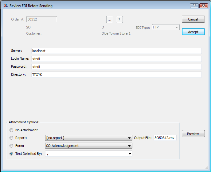 Example of Review EDI window for a Sales Order sent by FTP